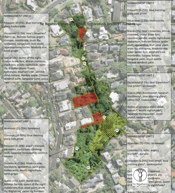 Te Ngahere is working in the restoration area in 5 management units. Here is a map that shows where the units are located and what invasive species are dominant in those.